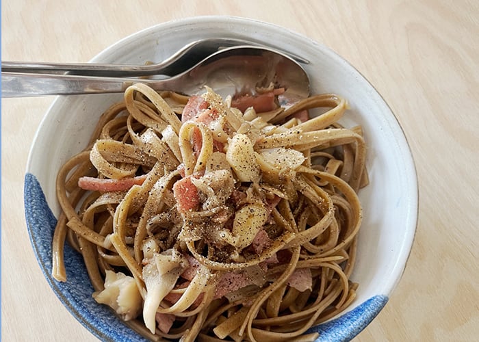 ③ 1の湯で時間の間に2の作業をしていき、茹で上がった1を2に入れパルミジャーノチーズと塩コショウで味付けていく。