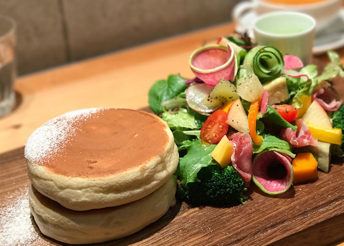 【一例】そば粉のパンケーキにチーズをのせてオーブンで焼いてドレッシングで和えたサラダと生ハムをのせる。